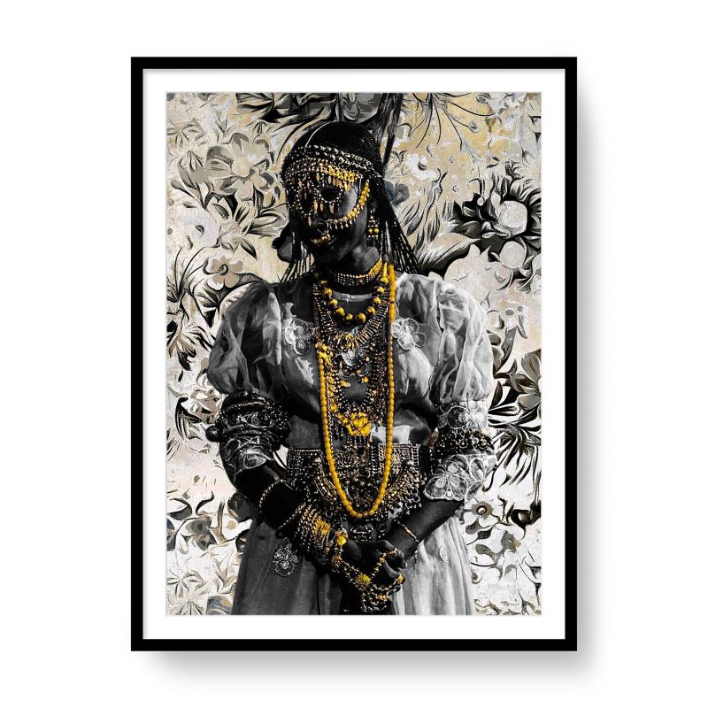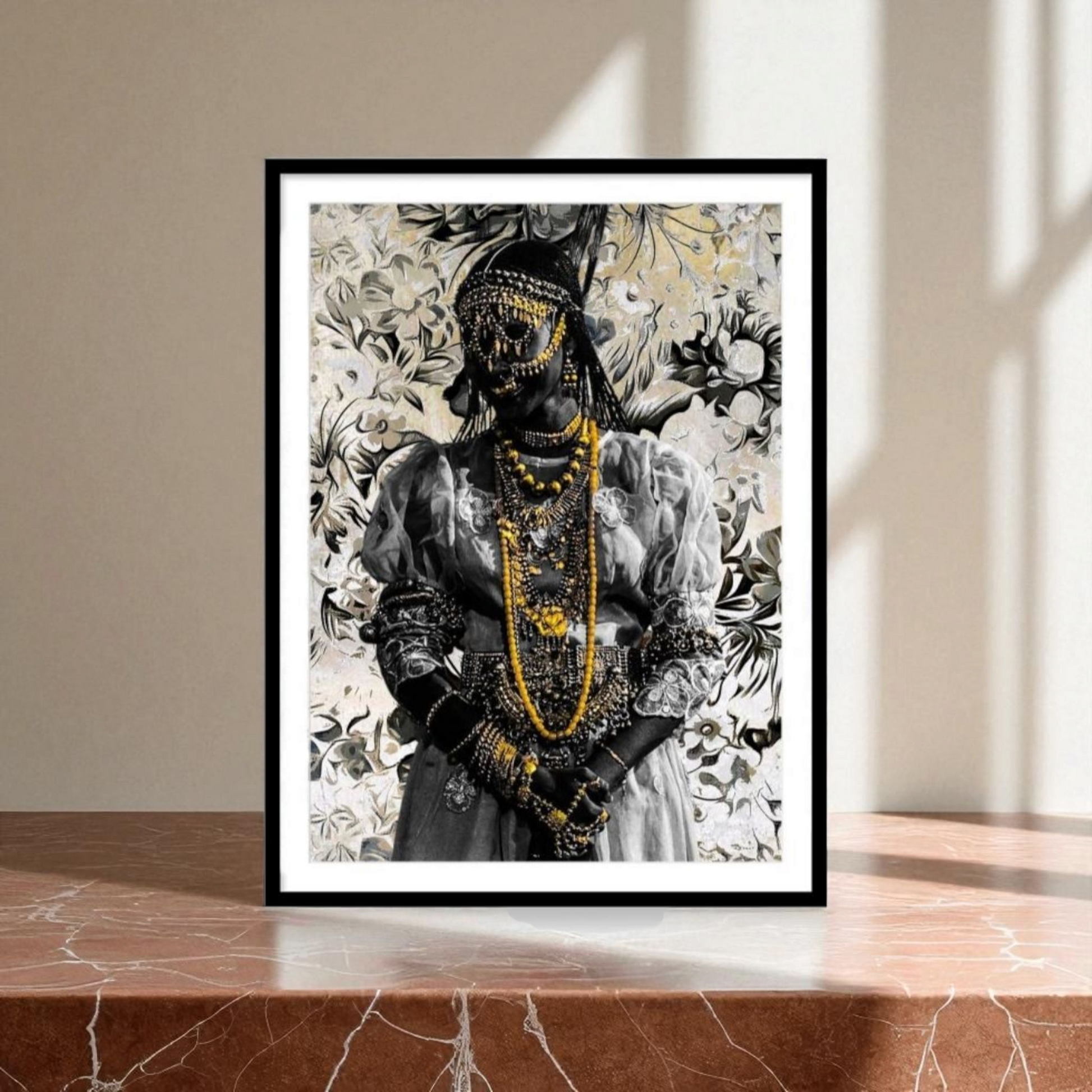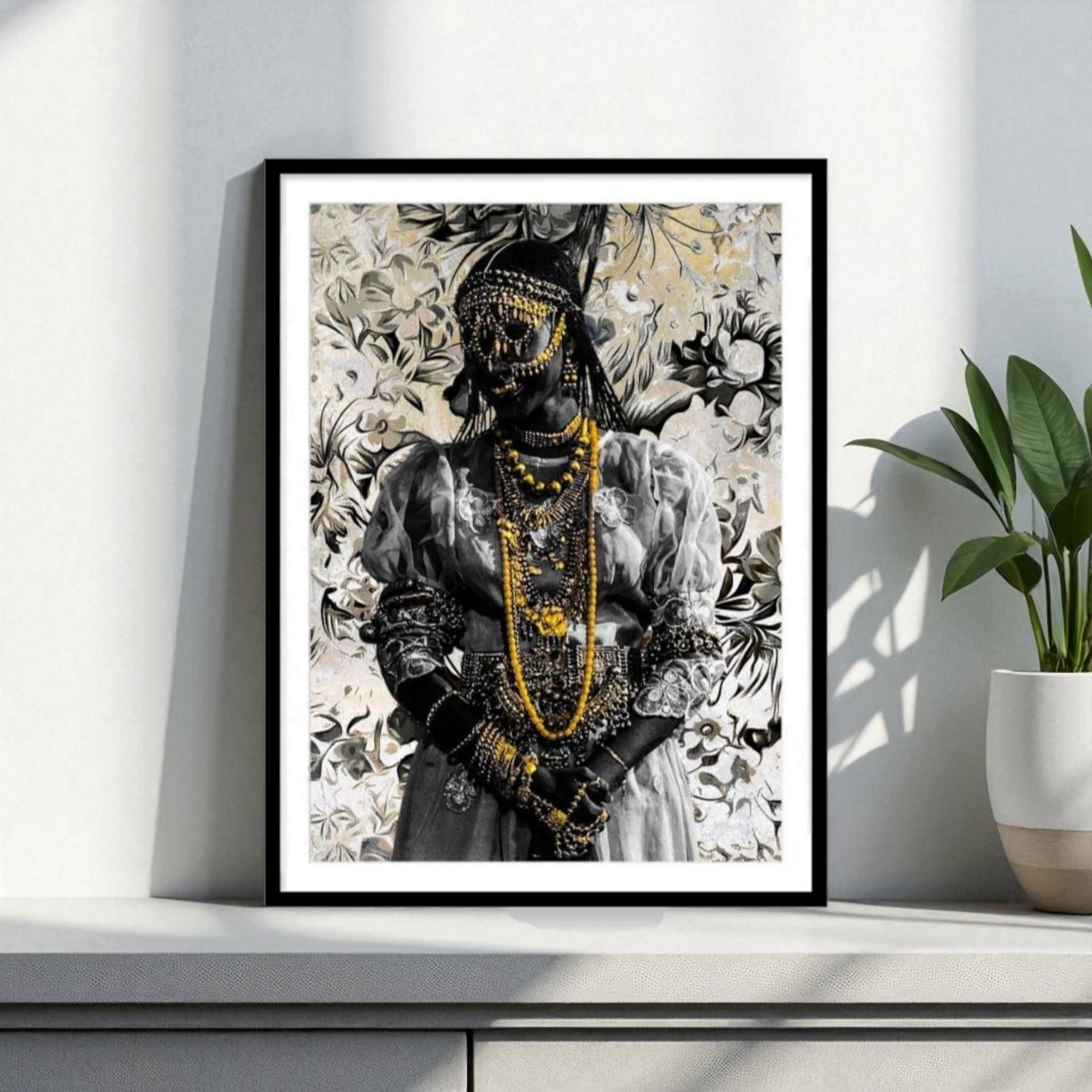 This Eden Framed Art Print features a striking portrait of a beautiful African woman adorned with golden flowers, elegantly captured within a sleek matte black frame. Printed on textured matte fine art paper, the piece offers rich detail and a sophisticated finish, making it a refined addition to any space seeking cultural depth and artistic excellence.